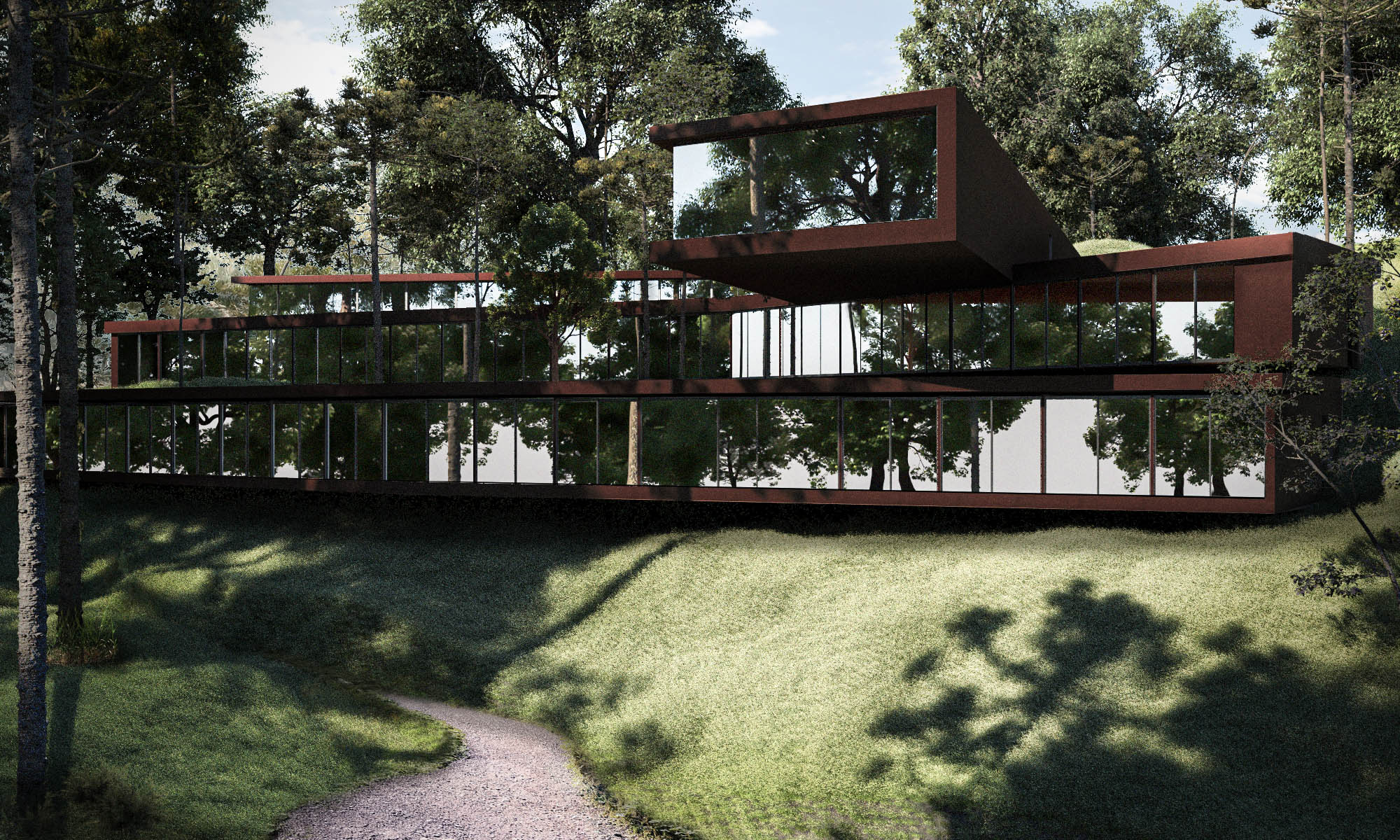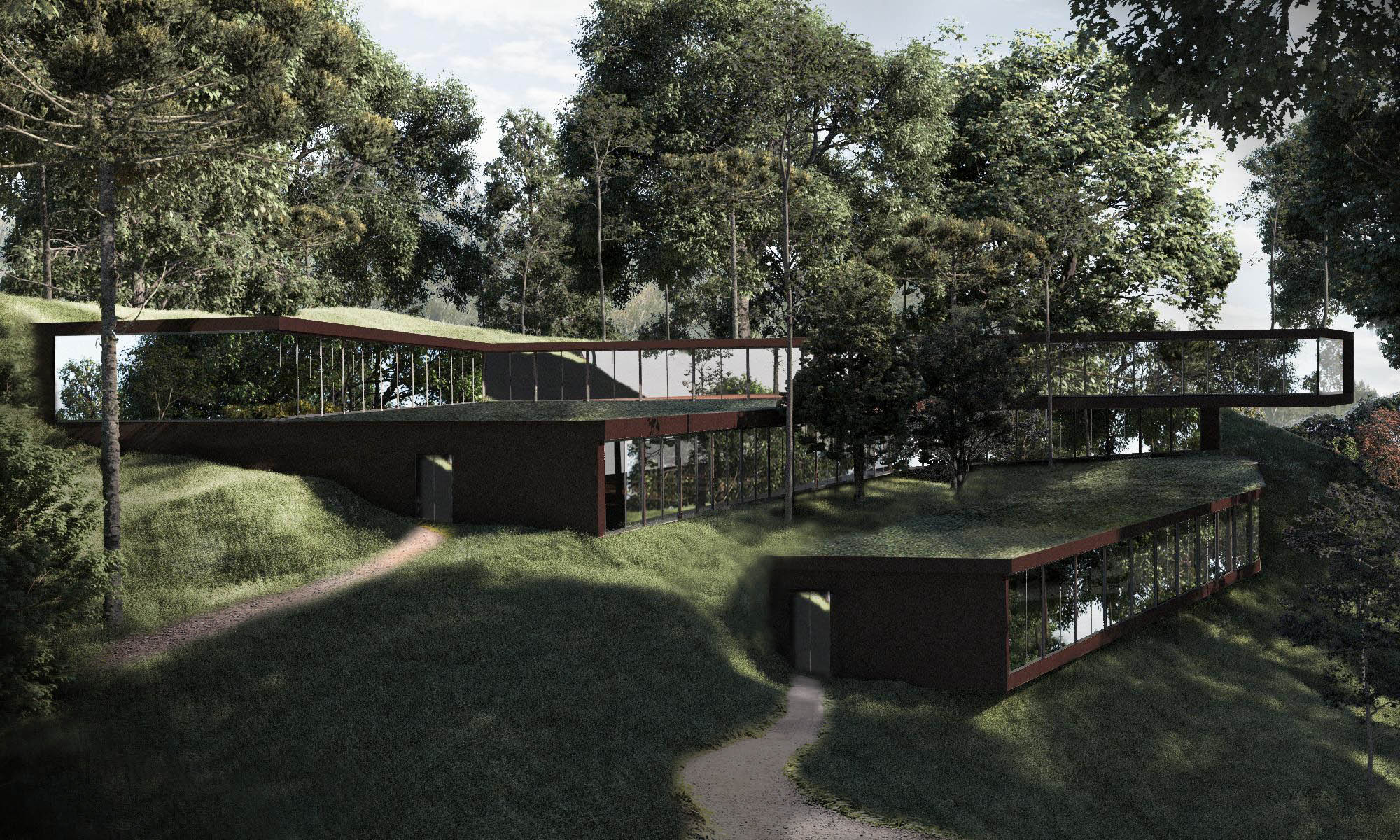 Le facciate principali sono state pensate per essere interamente vetrate, offrendo un senso di trasparenza e continuità con il paesaggio. Le coperture, trattate a verde, contribuiscono ulteriormente all’integrazione dell’opera nell’ambiente naturale, riducendo al minimo l’impatto visivo. Le parti opache, emergenti dal terreno, sono rivestite in lamiere di corten, un materiale scelto la sua capacità di dialogare con le cromie naturali del contesto.