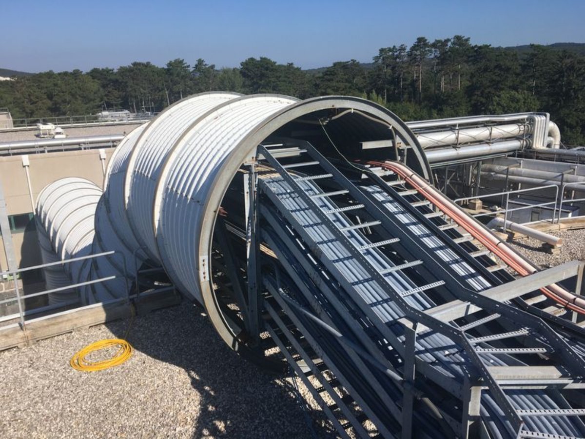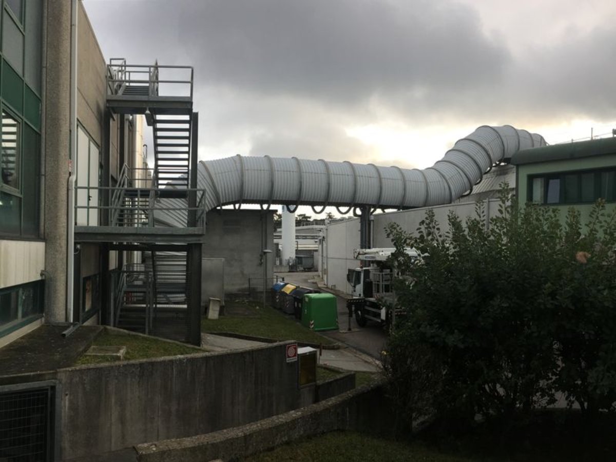 Nel cuore del comprensorio di Elettra Sincrotrone Trieste, la passerella portacavi “Anaconda” si snoda con la sua inconfondibile geometria cilindrica, accompagnando con leggerezza le volumetrie dell’edificio che sovrappassa.