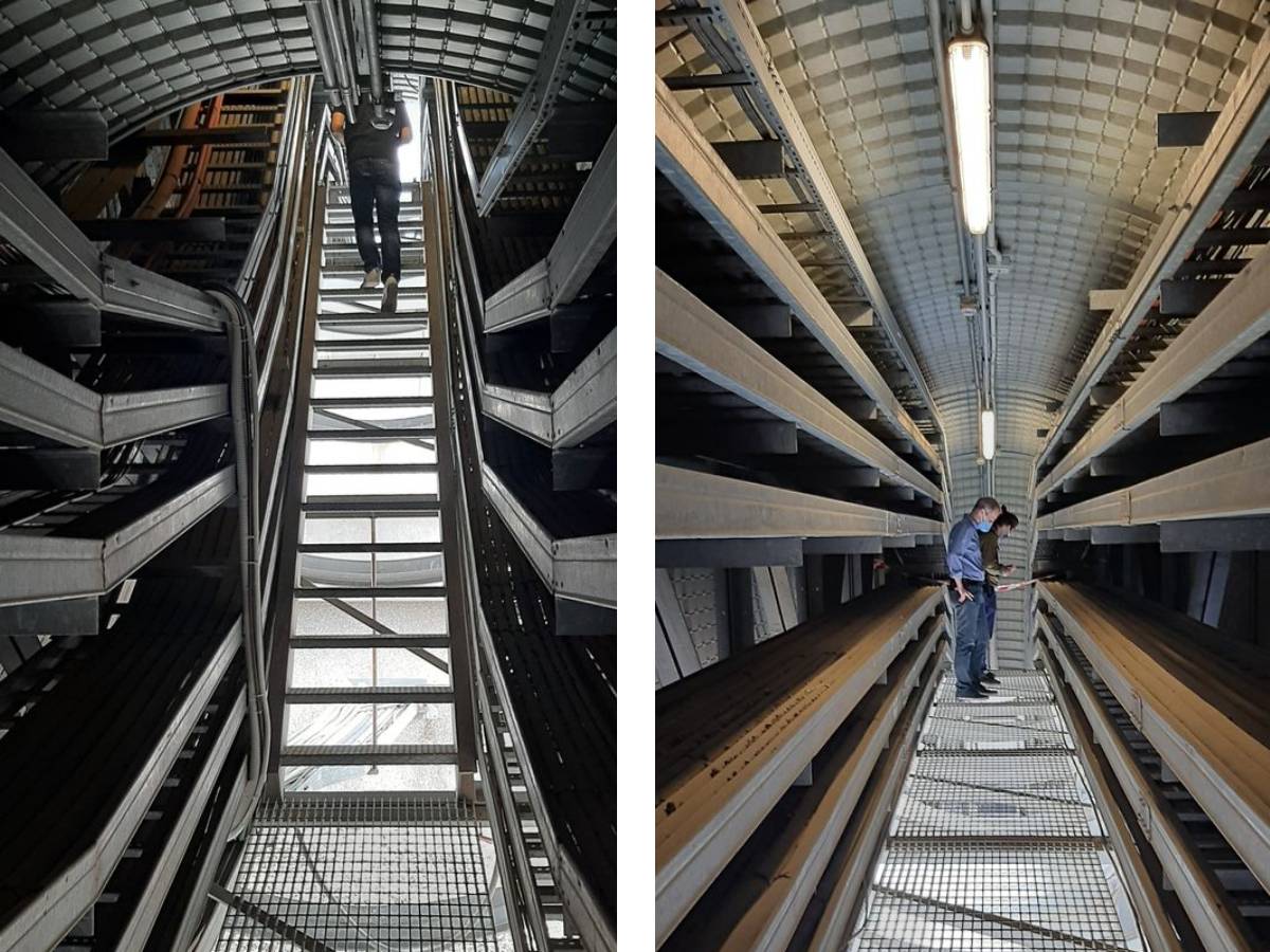 Realizzata nel 1992 come struttura metallica spaziale lunga circa 30 metri e dal diametro di 2 metri, la passerella si presenta come una vera e propria spina dorsale tecnologica, capace di connettere gli impianti e i sistemi vitali del complesso scientifico. All’interno, mensole porta cavi, camminamenti in grigliato e scalette a pioli ne fanno un’infrastruttura funzionale ma anche sorprendentemente accessibile.